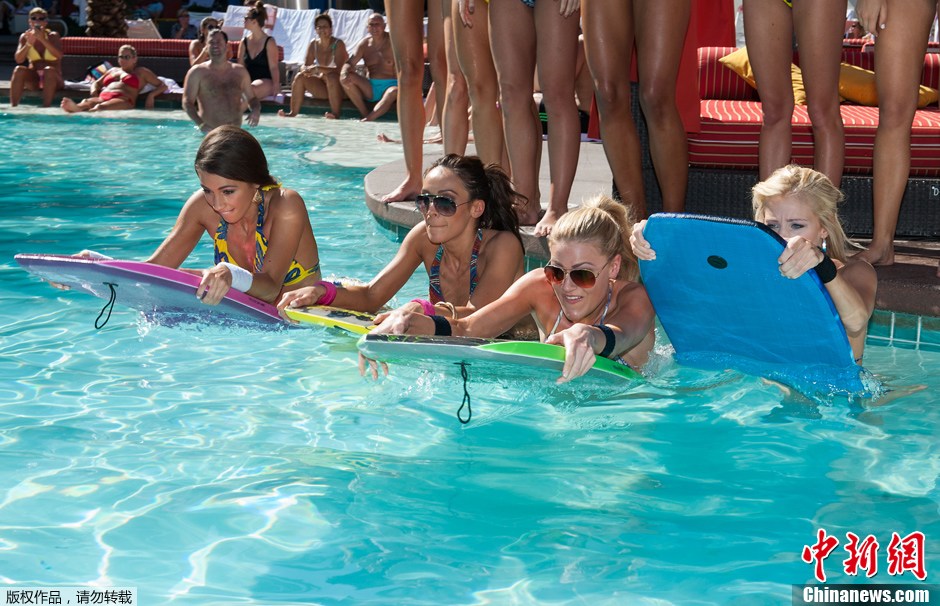 当地时间2013年6月6日,美国拉斯维加斯,美国各州小姐穿着比基尼进行滑水板赛。为了角逐“美国小姐”桂冠,她们将进行为期两周的“特训”,包括游览、排练等。