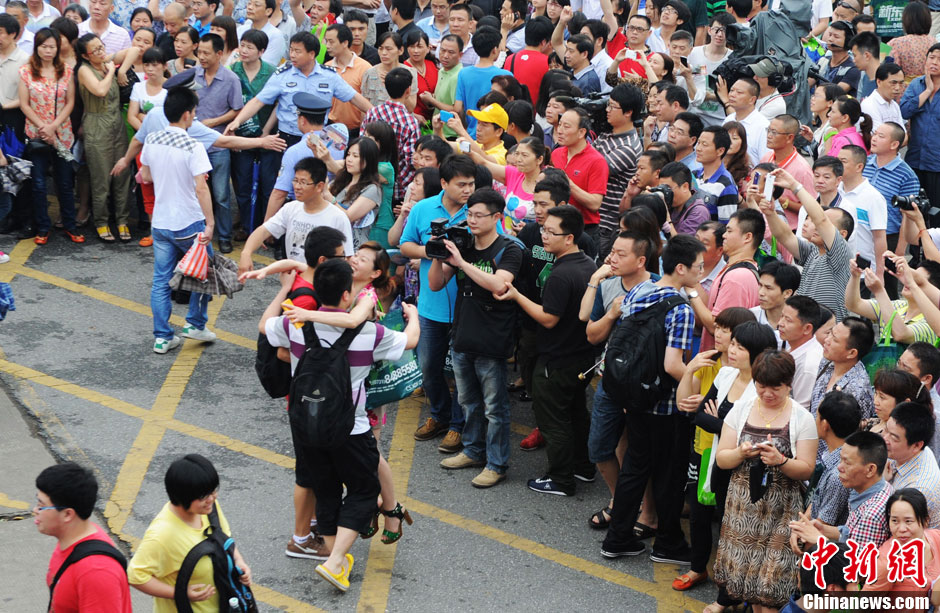 6月7日,2013年普通高等学校招生考试首门科目考试结束,两位考生走出湖南师大附中考点与家长相拥。中新社发 杨华峰 摄