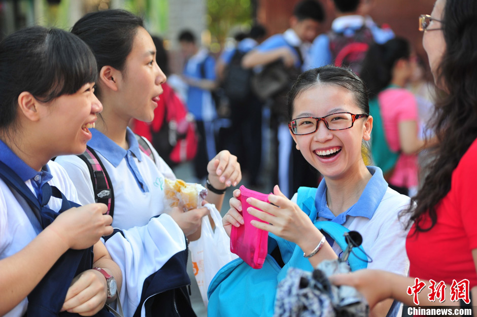 6月7日,深圳逾3.66万高考学生进入38个考点。在高考福田中学考场大门外,齐声高呼“满分!满分!加油!加油!”。送考老师穿着红T恤在考场外和学生拥抱、击掌、祈福,以各种方式为考生加油打气,鼓励考生沉着镇静、看清试题,考生们脸上充满了自信和开心。图为福田中学美丽考生黄玉鑫灿烂笑容。中新社发 陈文 摄