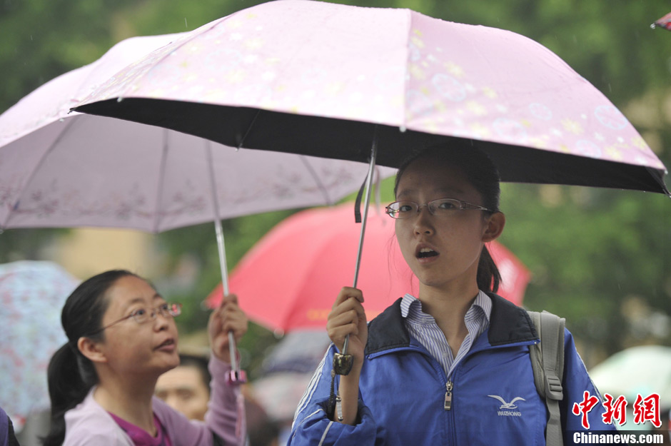 考生家长雨中翘首以盼