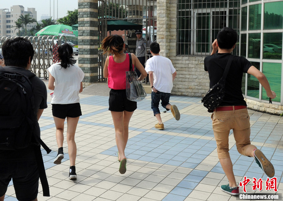 6月7日上午,2013年全国高考首日。位于福建福州三中金山校区考点外,开考时间临近,一名女考生飞奔“冲刺”跑进考场。中新社发 刘可耕 摄