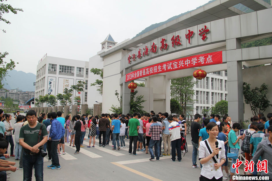 6月7日上午,四川芦山地震灾区宝兴中学考点考生有序进入考场。宝兴中学是宝兴县唯一一所设有高中部的高级中学,在校高三应届毕业班考生共有192人。此次宝兴参加高考的学生共有446人,因受“420”芦山强烈地震影响,通往宝兴唯一一条“生命通道”S210线仍有安全隐患,为确保考生安全,根据四川省安排,宝兴首次异地设置分考场,凡是在外借读,具有宝兴户籍的高三考生在雅安市雨城区七中参加高考,且不受限制,也可享受高考加分政策。中新社发