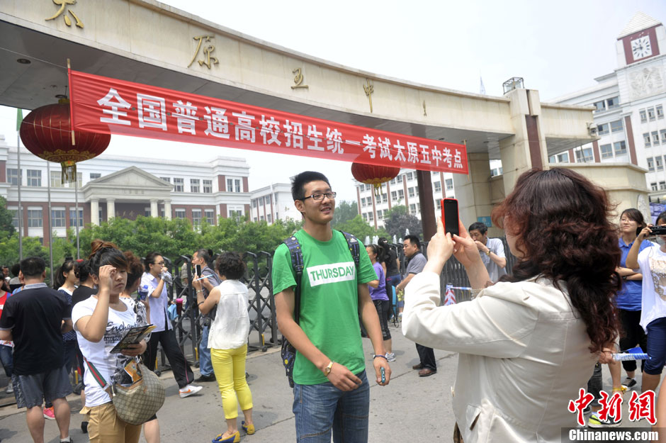 6月7日,2013年普通高等学校招生考试首门科目考试结束。在山西太原五中考点,一名考生家长为刚考完第一科的孩子留影。中新社发 韦亮 摄