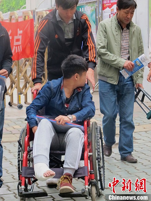 6月7日,中国高等教育入学考试在全国各地统一举行。图为新疆乌鲁木齐第八中学门口,一位坐轮椅的考生在同学的帮助下来到考点。中新社发 杨喆 摄