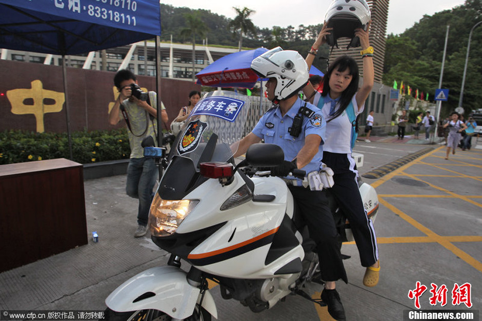 6月7日,深圳市红岭中学考点,一名学生走错考场,情急之下交警用摩托车将考生准时送达。高雷 摄 图片来源:CFP视觉中国