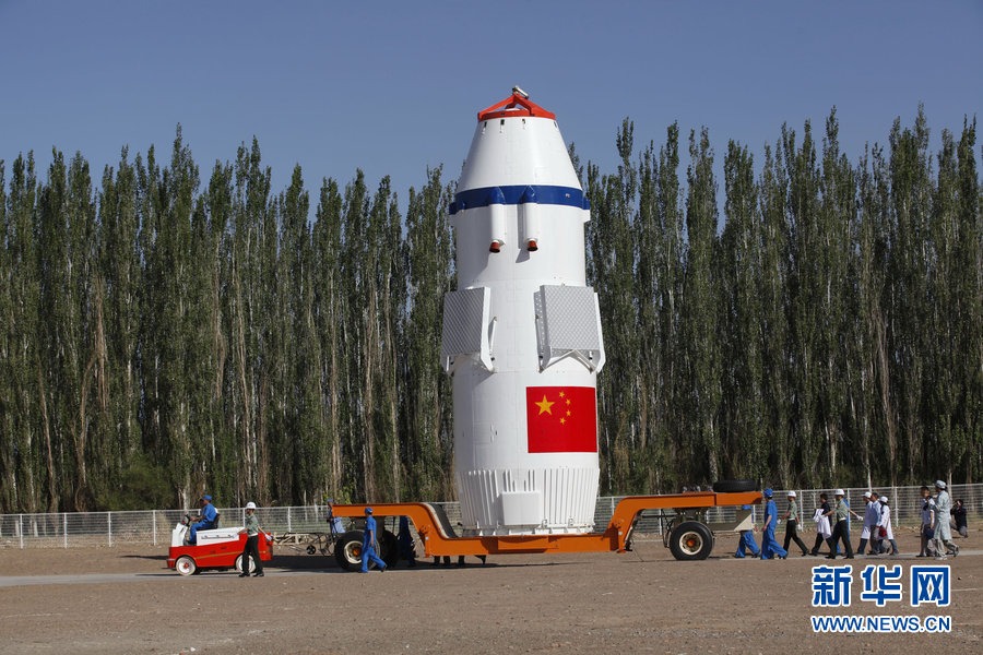 中国载人航天工程新闻发言人宣布,我国将于6月中旬择机发射神舟十号飞船,3名航天员将再次访问天宫一号。2013年6月3日,神舟十号飞船、长征二F遥十火箭组合体,从酒泉卫星发射中心载人航天发射场技术区垂直转运至发射区。这标志着神舟十号飞船发射已进入最后准备阶段。图片来源:新华网