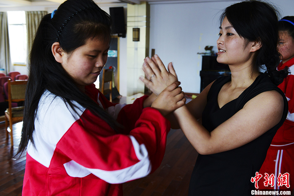 他们在音律上学得很快,但是在动作和姿势上常常需要手把手的教,老师会让她们握着双手感受节拍。中新社发 张元 摄