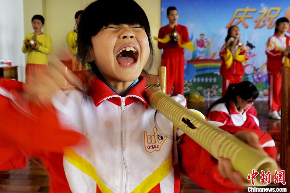 9岁的安星星是乐队中年龄最小的,排练也是最努力的,这是她敲坏的第三个竹筒。中新社发 张元 摄