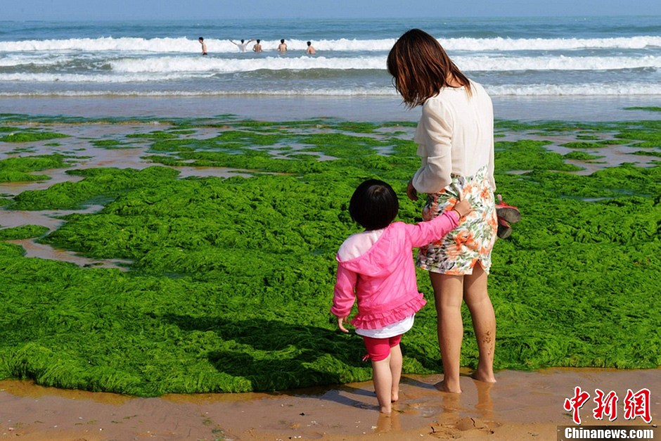 6月9日,浒苔“先锋”正式登陆青岛海岸,一些海岸和沙滩上已经出现浒苔堆积。浒苔绿藻的“先锋部队”已经抵达岛城前海一线,并随海浪吹伏逐渐逼近岸边。浒苔据了解,浒苔自从2007年开始,今年已是连续第七年入侵青岛海域,成为影响青岛海洋环境的常规性灾害。图为一对母女在浒苔的沙滩上游玩。图片来源:东方IC 版权作品 请勿转载