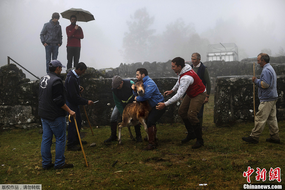 当地时间6月9日,西班牙Mougas民众参加“剃兽节”活动。该活动起源于15世纪,已经有五百多年的历史了。在节日期间,当地人将山脉上的野马赶至空地聚集在一起,然后勇敢的上前与野马摔跤搏斗,展示自己高超的驯马技巧,并给这些野马做记号和剃剪鬃毛。