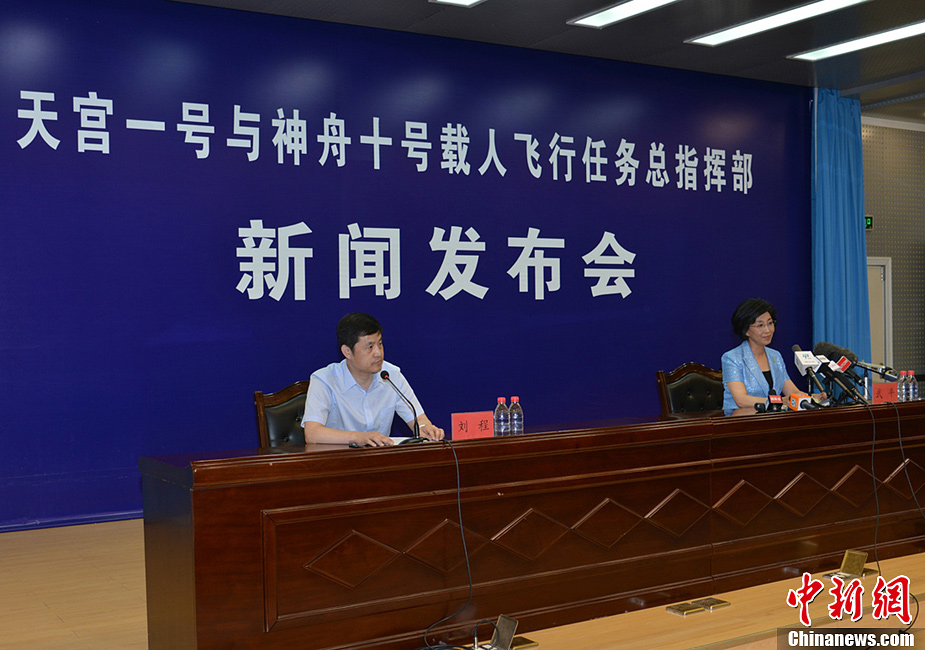 6月10日15时,天宫一号与神舟十号载人飞行任务总指挥部于举行新闻发布会。新闻发言人武平介绍,经任务总指挥部研究决定,定于6月11日17时38分发射神舟十号载人飞船。中新社发 秦宪安 摄