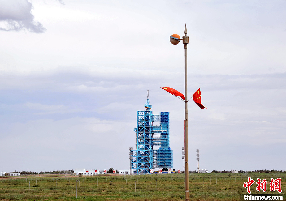 6月中旬,“神十”载人飞船择机发射,3名中国航天员将再次访问天宫一号。图为酒泉卫星发射中心中国载人航天发射场,远处的神舟十号载人飞船及其运载火箭长征二号F组合体与近处路灯杆上飘扬的五星红旗相映成趣,静待发射。中新社发 孙自法 摄
