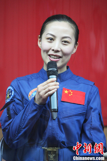 6月10日,“神十”航天员飞行乘组在酒泉卫星发射中心航天员公寓问天阁与记者举行见面会。“神十”航天员聂海胜、张晓光、王亚平首次集体亮相,并接受媒体采访。图为王亚平亮相。中新社发 张雷 摄