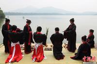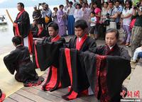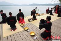6月10日,来自南京华夏文化传承社的五十多位汉文化爱好者齐聚在南京玄武湖畔,举行祭祀屈原仪式,弘扬传统文化,迎接端午佳节。端午节,又称端阳节、午日节、五月节等,最初是我国人们以祛病防疫的节日,后来传说爱国诗人屈原在这一天死去,也同时成了中国汉族人民纪念屈原的传统节日,“端午节”为国家法定节假日之一,并被列入世界非物质文化遗产名录。图为玄武湖畔行古礼。泱波 摄