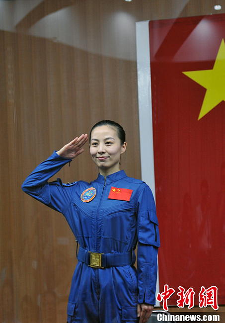 6月10日下午,执行天宫一号与神舟十号载人飞行任务的“神十”飞行乘组3名航天员聂海胜、张晓光、王亚平,在酒泉卫星发射中心航天员公寓问天阁内与中外媒体见面,并回答记者提问。图为航天员王亚平敬军礼。孙自法 摄