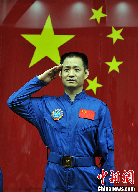 6月10日下午,执行天宫一号与神舟十号载人飞行任务的“神十”飞行乘组3名航天员聂海胜、张晓光、王亚平,在酒泉卫星发射中心航天员公寓问天阁内与中外媒体见面,并回答记者提问。图为将再度出征太空的航天员聂海胜敬军礼。孙自法 摄