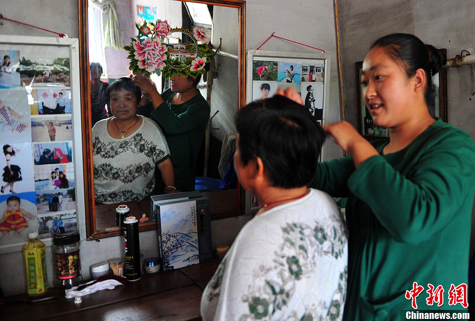 6月11日,张晓光的姐姐一大早让自己 的女儿为自己梳洗打扮。当日,神舟十号载人飞船定于17时38分在酒泉卫星发射中心发射,飞行乘组由男航天员聂海胜、张晓光和女航天员王亚平组成,聂海胜担任指令长。中新社发 于海洋 摄