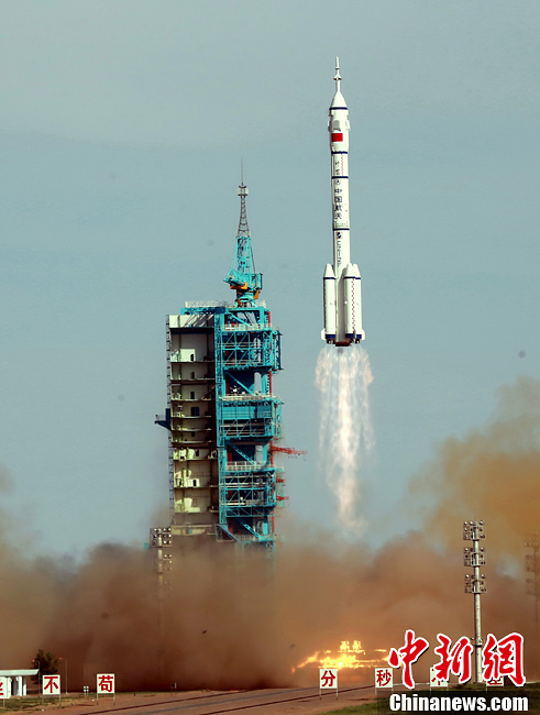 6月11日17点38分,神舟十号飞船准时点火成功升空。中国人民解放军航天员大队航天员聂海胜、张晓光和王亚平组成神十飞行乘组进入太空,三名航天员再次访问天宫一号,执行载人空间各项科学实验任务。中新社发 张雷 摄