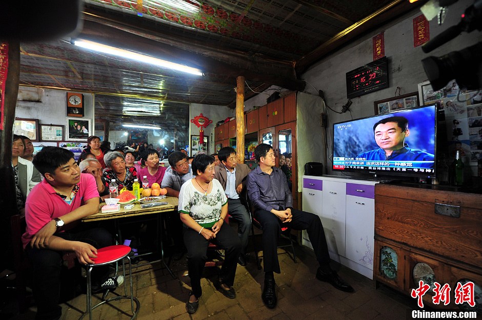 6月11日,在辽宁省锦州市黑山县的家乡亲友见证张晓光飞天圆梦。当日,神舟十号载人飞船在中国酒泉卫星发射中心顺利升空。聂海胜、张晓光和王亚平飞天圆梦。中新社发 于海洋 摄