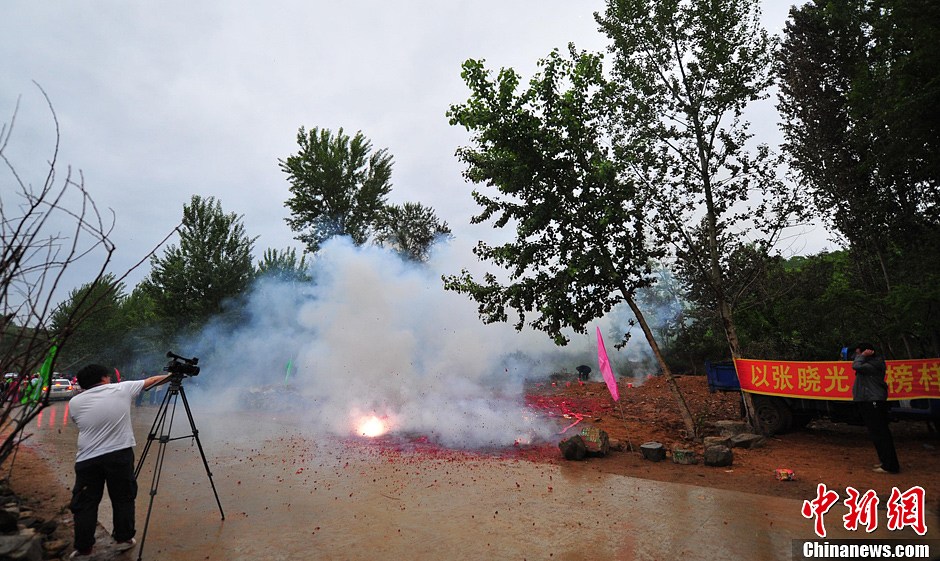 6月11日,在辽宁省锦州市黑山县的家乡亲友见证张晓光飞天圆梦,家人燃放鞭炮庆祝。当日,神舟十号载人飞船在中国酒泉卫星发射中心顺利升空。聂海胜、张晓光和王亚平飞天圆梦。中新社发 于海洋 摄