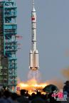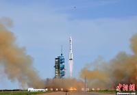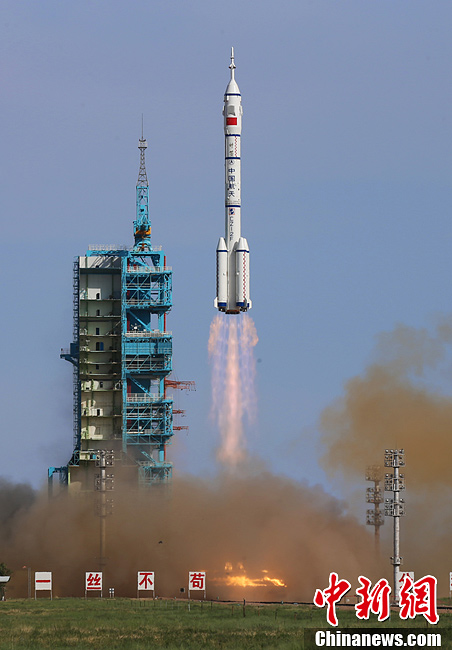 6月11日傍晚,神舟十号载人飞船在酒泉卫星发射中心中国载人航天发射场顺利点火升空,聂海胜、张晓光、王亚平3名航天员搭乘飞天。中新社发 秦宪安 摄