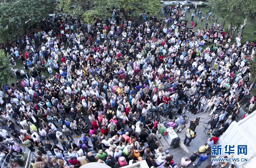 6月11日,在希腊首都雅典,人们聚集在国家广播电视公司总部大楼前,抗议政府关闭国家广播电视公司的决定。作为应对债务危机的紧缩和改革措施的一部分,希腊政府11日宣布关闭国家广播电视公司。希腊政府发言人凯蒂科格鲁说,管理不善和腐败是政府决定关闭这家公司的主要原因。他说,该公司每年要花掉纳税人3亿欧元(约合24.5亿元人民币)资金,比类似的私营广播电视公司高出7倍。希腊国家广播电视公司成立于1938年,目前有3个全国性电视频道和一个国际卫星电视频道,还有28家电台,有员工近3000人。马里奥斯·罗洛斯摄 图片来源:新华网