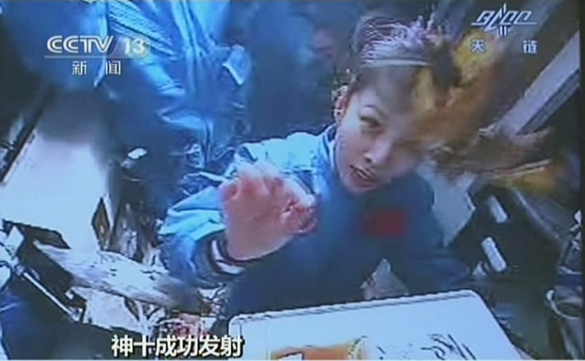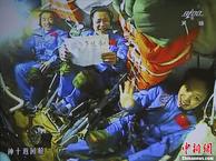 6月12日下午,三位航天员端坐于“神十”返回舱内。经过与地面测控人员沟通后,聂海胜发出祝福:今天是中华民族的传统佳节--端午节,我们神十航天员向全国人民、全球华人致以节日的祝福,祝大家端午节快乐!电视截图