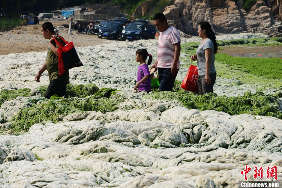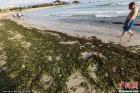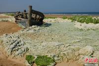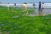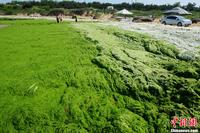 青岛沙滩浒苔侵袭 堆积暴晒成“绿白海岸”