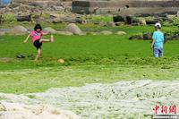 6月12日,游人在青岛海滩边休闲游玩。连日来,进入山东青岛沿海海岸和沙滩上的浒苔在夏日烈日的暴晒下形成白色表层,与刚上岸的绿色浒苔形成绿白相间的“彩色海岸”。 中新社发 金少月 摄 图片来源:CNSPHOTO