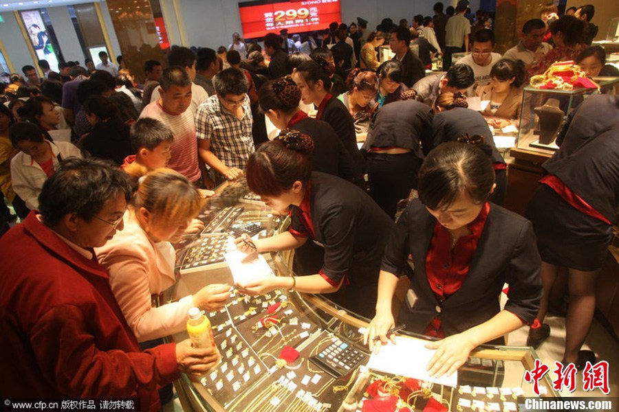 2013年06月11日,济南省城泉城路上,一家金店门前,近万人挤爆现场抢购黄金。据了解,该金店在端午节三天让利,打出黄金每克299元每克,每人限购一件的促销活动,比市场价要便宜50元至70元每克,大的让利吸引众多市民前来抢购黄金,其中选购时间只有15分钟时间。 依旧 摄 图片来源:CFP视觉中国