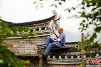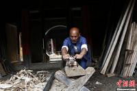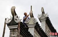 广西桂林市全州县古稀农民唐以金用尽一生积蓄,将一个因高铁建设而拆迁的古村庄的数十座古建筑群整体搬迁复建,欲建成一个古民俗博物馆,并准备在竣工之后,无偿捐献给国家。据了解,这组古民居中以该村清代先贤蒋仁禄建于嘉庆三年(公元1798年)的家宅、和好铺学馆及蒋子麟宅三座建筑最为精美,是代表岭南地区传统建筑文化的老建筑。目前,该古民俗博物馆主体建筑施工已完成三分之二。图为唐以金正在马头墙上塑墀头。中新社发 梁倩 摄