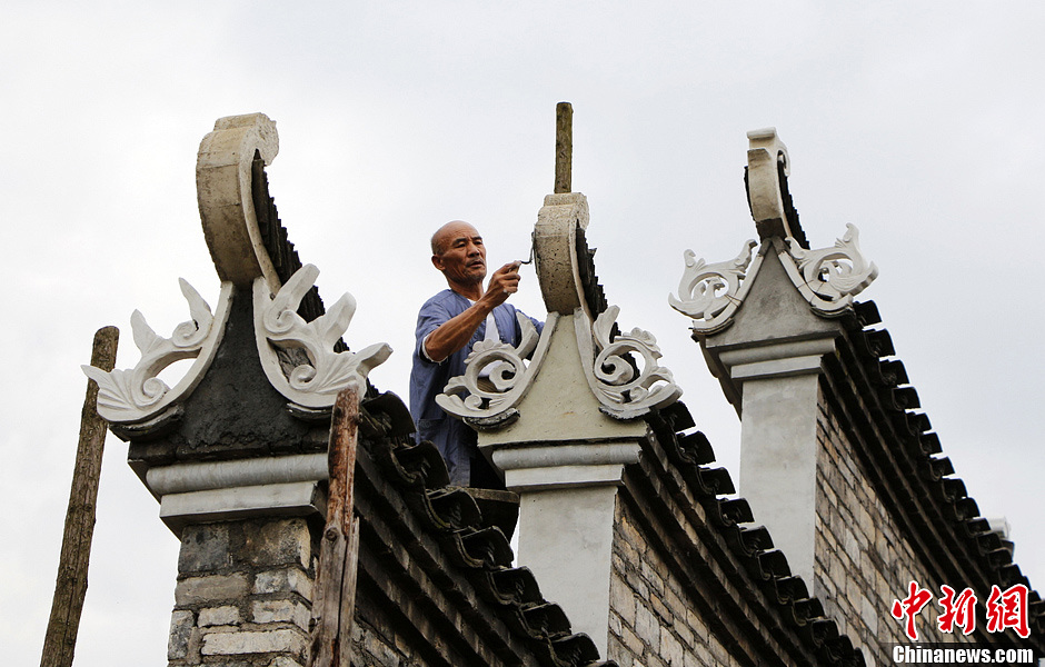 广西桂林市全州县古稀农民唐以金用尽一生积蓄,将一个因高铁建设而拆迁的古村庄的数十座古建筑群整体搬迁复建,欲建成一个古民俗博物馆,并准备在竣工之后,无偿捐献给国家。据了解,这组古民居中以该村清代先贤蒋仁禄建于嘉庆三年(公元1798年)的家宅、和好铺学馆及蒋子麟宅三座建筑最为精美,是代表岭南地区传统建筑文化的老建筑。目前,该古民俗博物馆主体建筑施工已完成三分之二。图为唐以金正在马头墙上塑墀头。中新社发 梁倩 摄