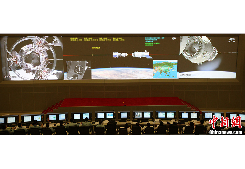 北京时间6月13日13时18分,天宫一号目标飞行器与神舟十号飞船成功实现自动交会对接。图为北京航天飞行控制中心指挥大厅大屏幕播出对接实时画面。中新社发 孙阳 摄