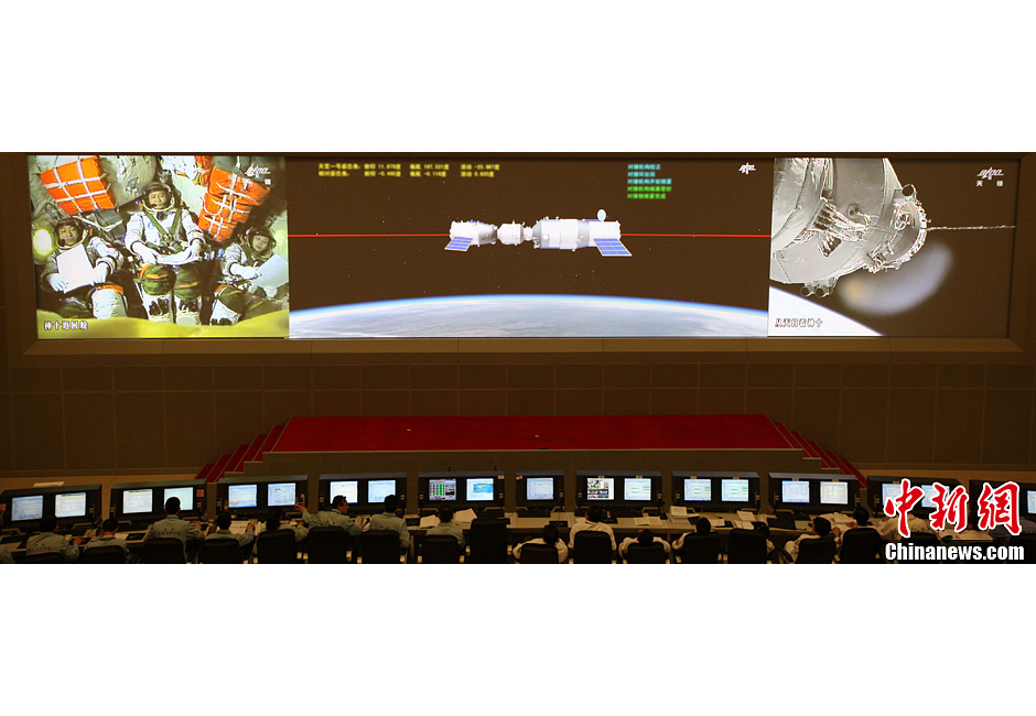 北京时间6月13日13时18分,天宫一号目标飞行器与神舟十号飞船成功实现自动交会对接。图为北京航天飞行控制中心指挥大厅大屏幕播出对接实时画面。中新社发 孙阳 摄