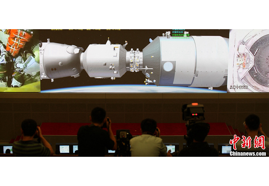 北京时间6月13日13时18分,天宫一号目标飞行器与神舟十号飞船成功实现自动交会对接。图为北京航天飞行控制中心指挥大厅大屏幕播出对接实时画面。中新社发 孙阳 摄