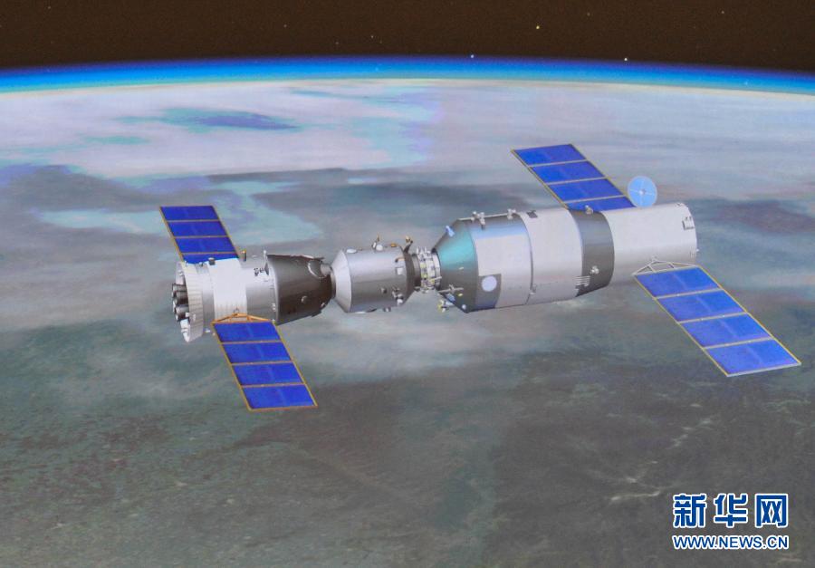 6月13日拍摄的北京航天飞行控制中心大屏幕,显示神舟十号与天宫一号自动交会对接成功的模拟画面。当日13时18分,搭载着3名航天员的神舟十号飞船与天宫一号目标飞行器成功实现自动交会对接。刘潺 摄 图片来源:新华网