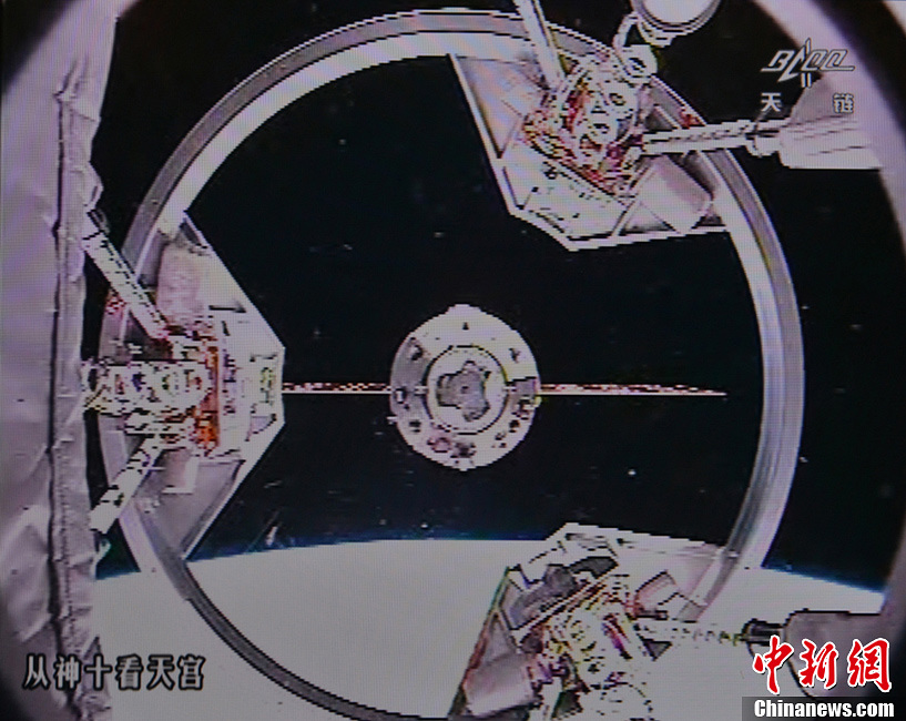 搭载着3名航天员的神舟十号飞船6月13日13时18分与天宫一号目标飞行器成功实现自动交会对接。这是天宫一号自2011年9月发射入轨以来,第5次与神舟飞船成功实现交会对接。图为从神舟十号看与天宫一号交会对接全过程实时画面。中新社发 秦宪安 摄