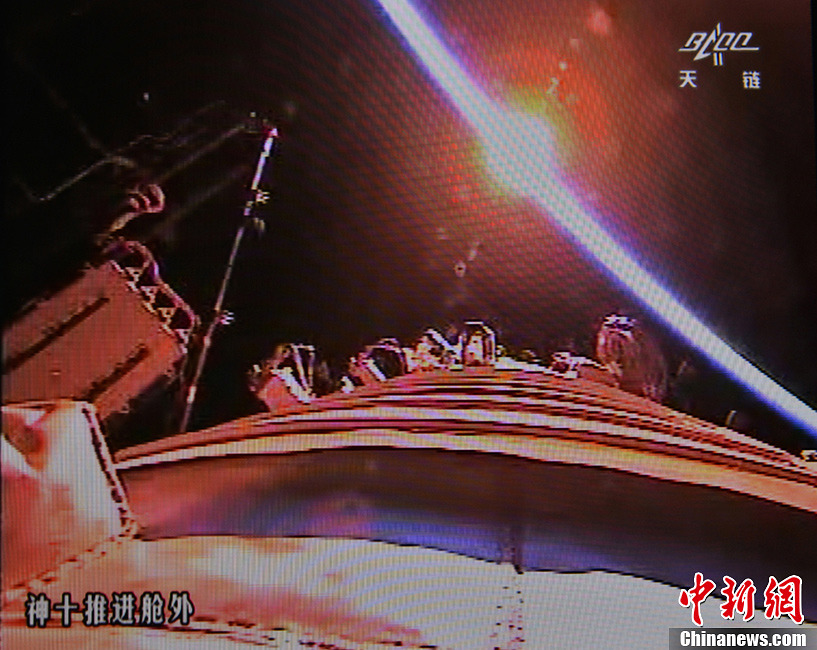 搭载着3名航天员的神舟十号飞船6月13日13时18分与天宫一号目标飞行器成功实现自动交会对接。这是天宫一号自2011年9月发射入轨以来,第5次与神舟飞船成功实现交会对接。图为神舟十号舱外看地球实时画面。中新社发 秦宪安 摄