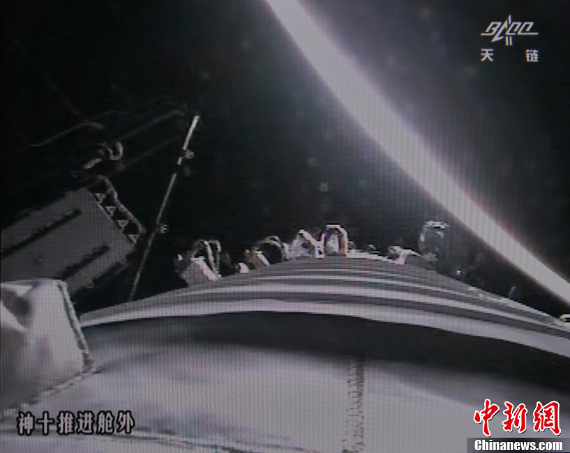 搭载着3名航天员的神舟十号飞船6月13日13时18分与天宫一号目标飞行器成功实现自动交会对接。这是天宫一号自2011年9月发射入轨以来,第5次与神舟飞船成功实现交会对接。图为从神舟十号看与天宫一号交会对接全过程实时画面。中新社发 秦宪安 摄