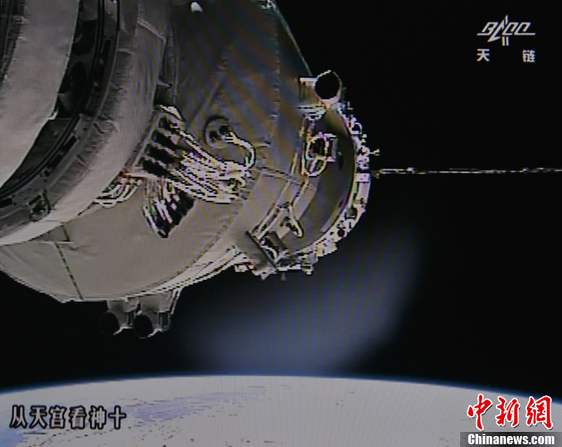 搭载着3名航天员的神舟十号飞船6月13日13时18分与天宫一号目标飞行器成功实现自动交会对接。这是天宫一号自2011年9月发射入轨以来,第5次与神舟飞船成功实现交会对接。图为从天宫一号看与神舟十号交会对接全过程实时画面。中新社发 秦宪安 摄