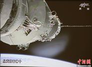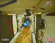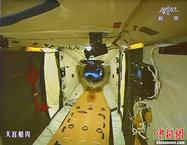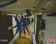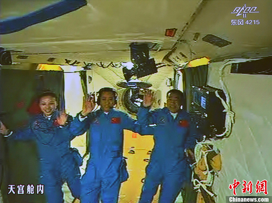 北京时间6月13日16时17分,神舟十号航天员成功开启天宫一号目标飞行器舱门,聂海胜、张晓光、王亚平以漂浮姿态进入天宫一号,通过安装在舱内的摄像机镜头向地面科研人员挥手致意。中新社发 秦宪安 摄