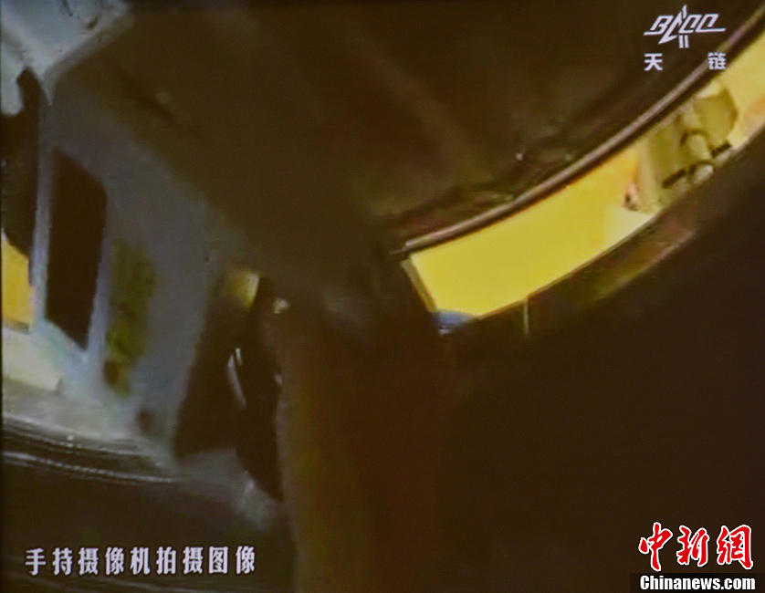 北京时间6月13日16时17分,神舟十号航天员成功开启天宫一号目标飞行器舱门,聂海胜、张晓光、王亚平以漂浮姿态进入天宫一号。图为天宫一号舱门打开。中新社发 秦宪安 摄