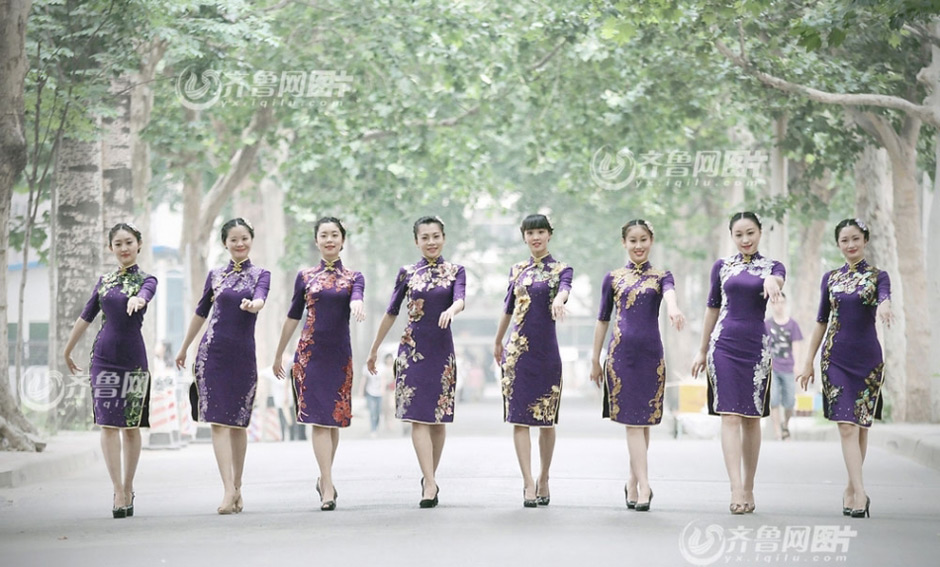 青春的舞姿,创意的盛宴。在闪光灯此起彼落间,定格的是一个个青葱故事,还有足够让他们奢侈挥霍的青春。毕业季来临,另类毕业照成为不少大学毕业生纪念在校时光的一种方式。图为山东师范大学09级舞蹈系毕业班的同学身着舞蹈《秦淮河畔的歌声》服装拍摄毕业照。八位毕业生紫色旗袍出镜,十分惊艳。林小木 摄 图片来源:齐鲁网