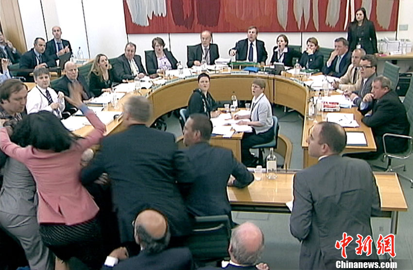 图为2011年7月19日,在英国议会就《世界新闻报》窃听丑闻质询默多克父子时,一名男子突然从听众席窜起,手拿餐盘,跨过默多克旁边的人对其袭击,身后其妻子邓文迪迅速起身反击,第一时间抬手准备给袭击者一巴掌。袭击者随后被警方带走。