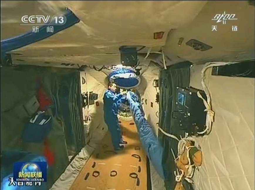 6月14日上午,神舟十号航天员开始对天宫一号内装饰材料进行更换,拆除原来铺设的软质地板,装上新的硬质地板和新的限位装置。夜间值守航天员可休息。电视截图