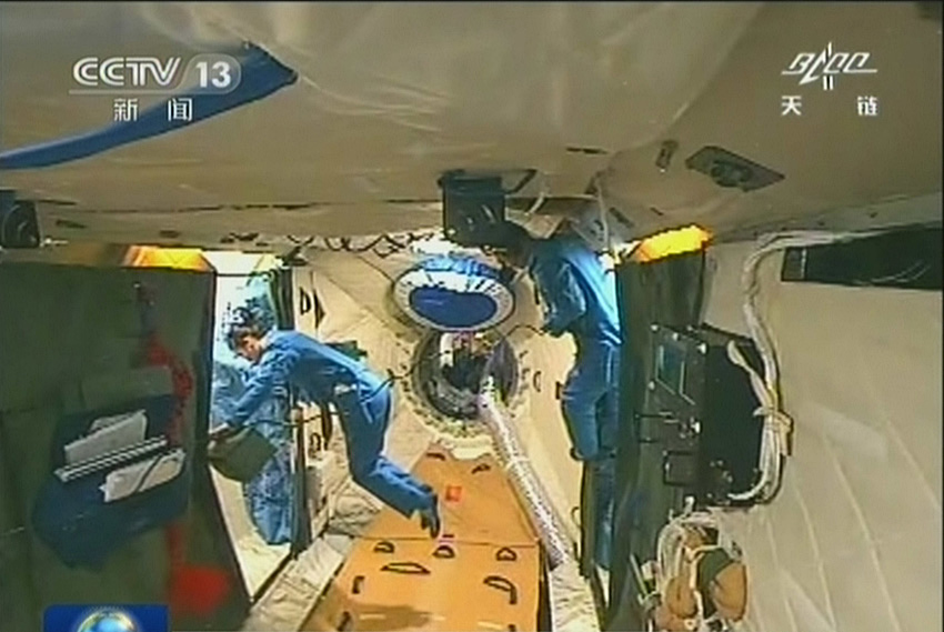 6月14日上午,神舟十号航天员开始对天宫一号内装饰材料进行更换,拆除原来铺设的软质地板,装上新的硬质地板和新的限位装置。夜间值守航天员可休息。电视截图