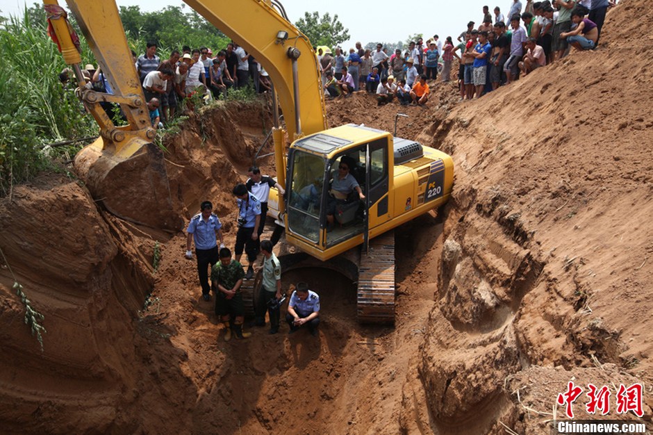 2013年6月15日晚,三名男子前往咸阳市秦都区双照镇北寺照村一处古墓偷盗,其中一名男子不慎被坍塌的盗洞掩埋。随后,两名同伴自首。6月17日下午1时许,该男子被救援人员挖出,已无生命迹象。图为现场救援人员正在挖掘死者。文稳翔 摄 图片来源:东方IC 版权作品 请勿转载