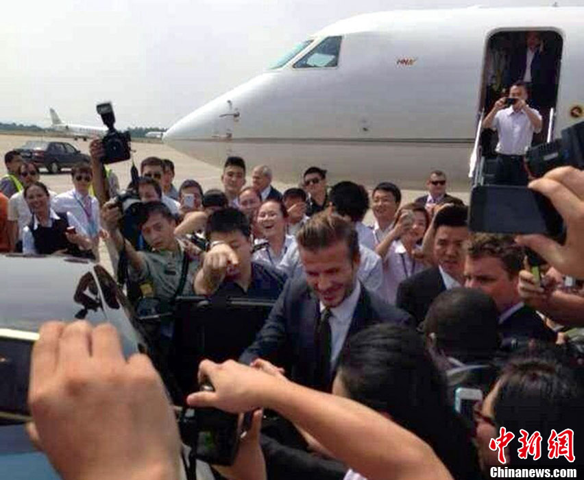 6月18日,南京,英格兰足球名星大卫·贝克汉姆乘飞机抵达南京。南京禄口机场俨然成了“追星场”,小贝从下飞机走到汽车前颇费周折,连现场的工作人员都变成了“贝氏粉丝”,拍照、签名,而贝克汉姆始终面带笑容,“万人迷”的魅力无法抵挡。韩飞 摄 图片来源:东方IC 版权作品 请勿转载
