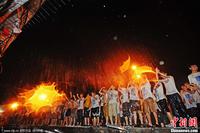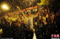 2013年6月18日晚至19日凌晨,武汉华中科技大学毕业晚会结束后,几十个院系的数千名学生摇起红旗喊起口号,从光谷体育馆出发,游行途径沁园、韵苑学生公寓,逢女生楼必求水狂泼,在校园夜色中恣意上演毕业游行和泼水大狂欢。彭年 摄 图片来源:CFP视觉中国
