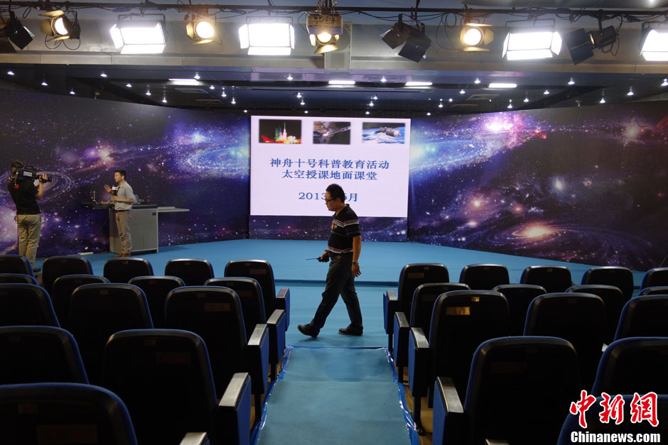 6月20日,神舟十号航天员将进行首次太空授课。按照计划,女航天员王亚平担任主讲,从而成为中国首位“太空教师”。图为北京人大附中地面课堂准备就绪。中新社发 廖攀 摄